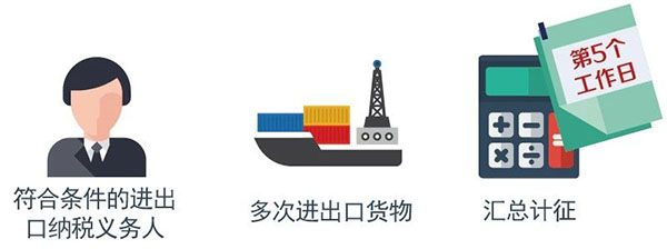 汇总征税,指海关对符合条件的进出口纳税义务人在一定时期内多次进出口货物应纳税款实施汇总计征,企业于每月第5个工作日结束前完成上月应纳税款的汇总支付。(详见海关总署公告2017年第45号)