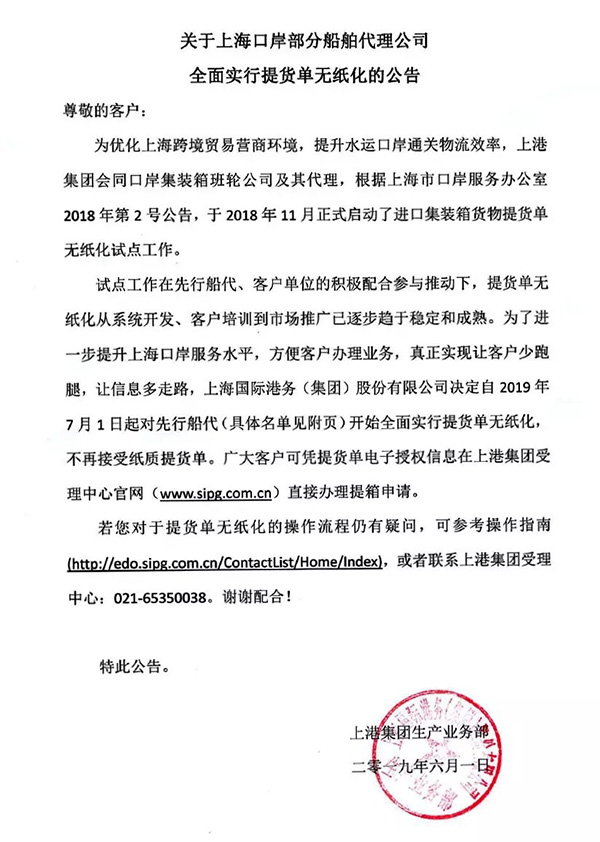 已经开通电子提货单的客户尽早使用,还未跟我司签约的客户请尽快到我司官网下载“进口电子提货单换单备案书”同时带好营业执照到我司进行备案,开通电子提货单权限。