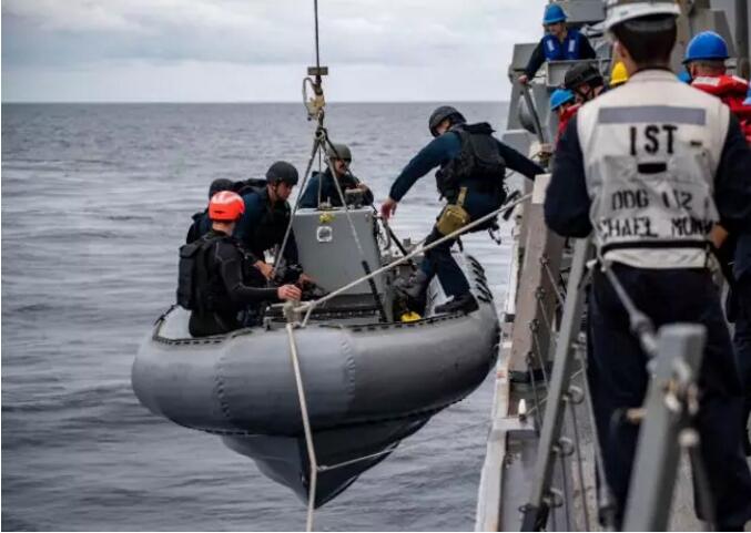 当直升机接近船只时,在船顶上开了一个舱口,三名船上人员开始将船内物品扔进水中。在直升机机组人员的指引下,导弹驱逐舰USS Michael Murphy拦截住可疑船只并收集了被扔入水中的物品。