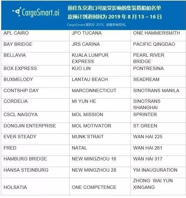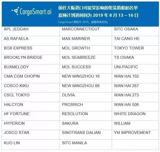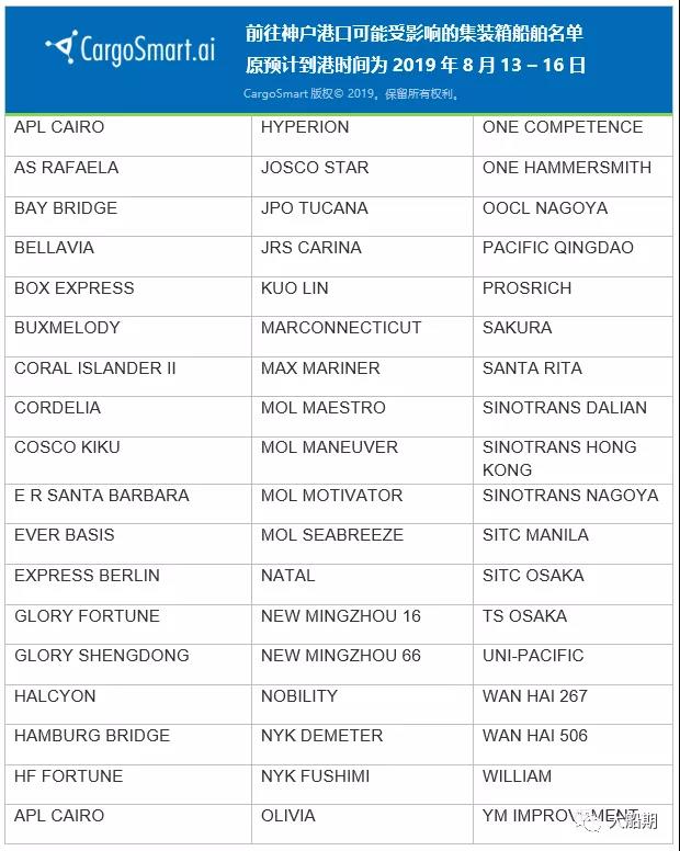 未来几日计划前往神户、大阪、东京和横滨港口的船舶船期或将因此受到影响。通过监测,以下107艘集装箱船舶船期可能受到影响,这些船舶的原定预计到港时间为8月13-16日: