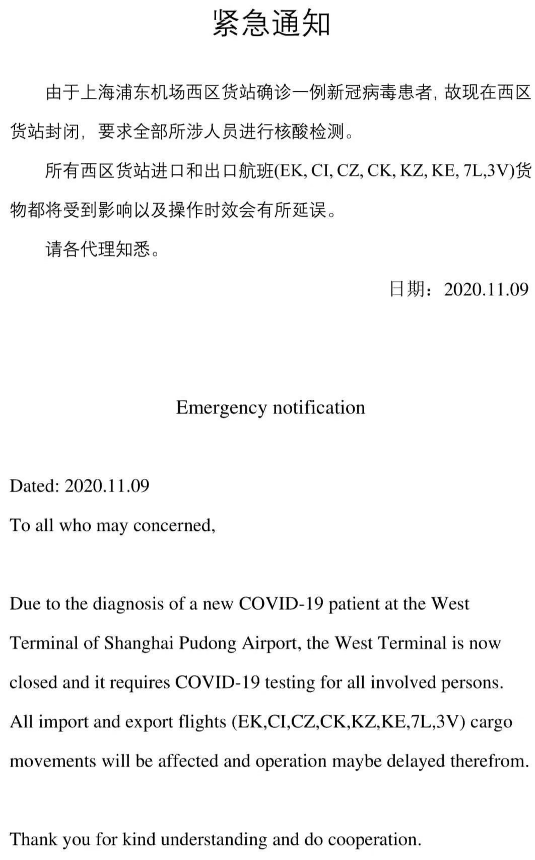 浦东机场部分货运站货物将会造成延误,请记得时刻关注航空公司最新动态,以免造成货物损失。突发!上海浦东机场货运站搬运工已确诊!货站封闭!空运货物延误!