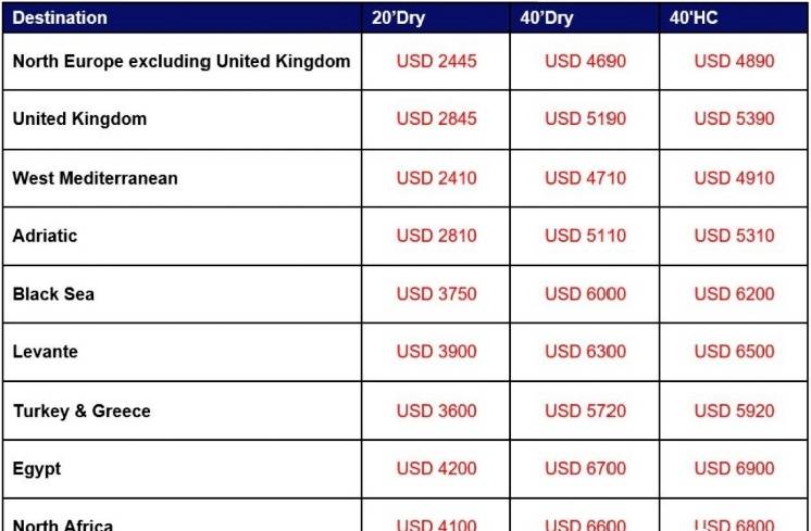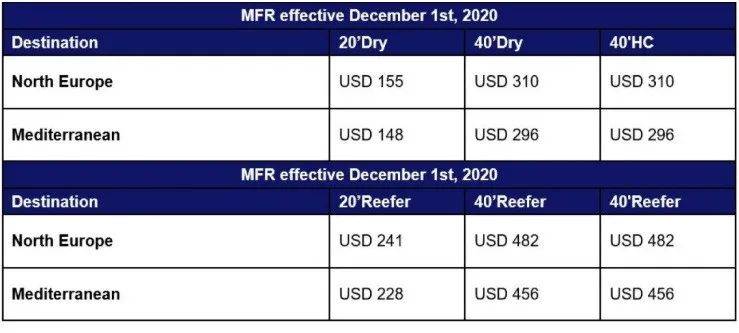 赫伯罗特日前告知客户,从12月1日起,亚洲到北欧的货运FAK费(不包括英国)将上调2000美元,至4890美元/40'H/C。 对于英国,赫伯罗特的FAK费将为$ 5390,对于西地中海港口,将适用于相同的费率并提高到$ 4910。 此外,北欧和地中海还将分别增加310美元和296美元的MFR(海洋燃料回收)附加费。