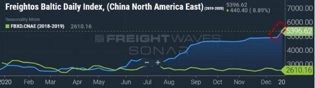 与此同时,亚洲-美国东海岸航线运价,也达到惊人的5397美元/FEU,较12月25日上涨9%,是2019年同期的两倍。