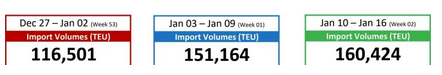 洛杉矶港表示2021年第一周将会有超过15万标箱进港, 1月上半月的舱单数据显示每周的货运量都在大大增加,预计下周会有超过160000个TEU到港。