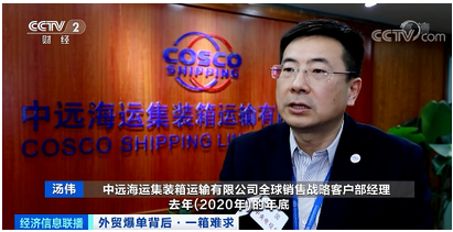 中远海运集装箱运输有限公司全球销售战略客户部经理 汤伟:从2020年6月开始截止到2020年年底共计增加了40艘船舶,整个运力增幅达到了20万标准箱。