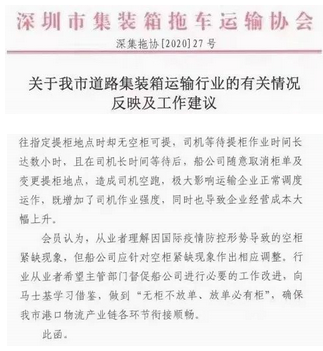 近期深圳集卡运输协会反映,船公司在放单后待司机去到堆场时,却发现无柜可提,或提箱点已经变更,甚至单方面被取消柜单。