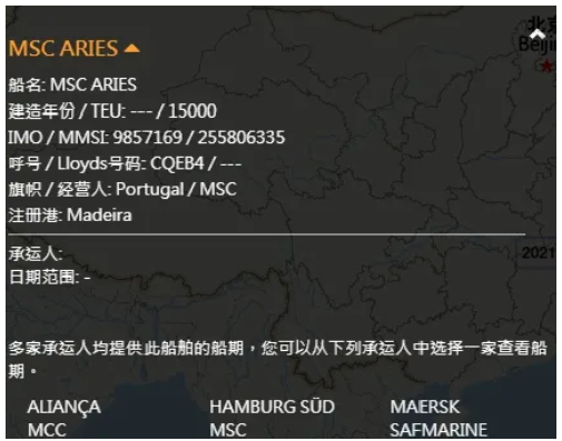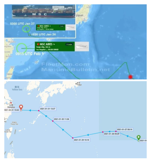 据外媒报道,2月1日“MSC ARIES”轮确认有集装箱丢失,据说有40多个,甚至更多。集装箱丢失后,该船降低了航行速度,截至2月1日仍在航行中,预计2月2日抵达宁波,原本预到宁波港的时间为1月30日。