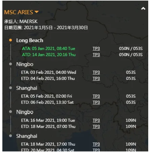 根据大船期数据显示,该轮服务于马士基TP3航线,接下来将要挂靠国内的宁波和上海港。共舱的船公司除了MSC,还有ALIAN?A、HAMBURG SüD、MAERSK、MCC、SAFMARINE、SEAGO、SM LINE。