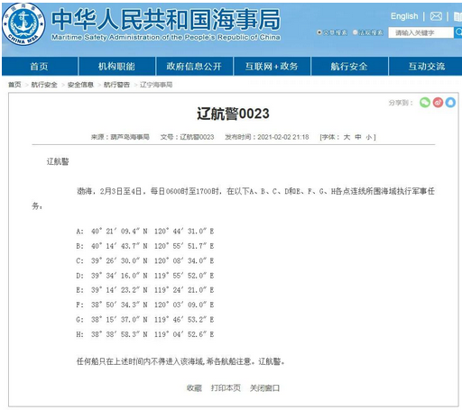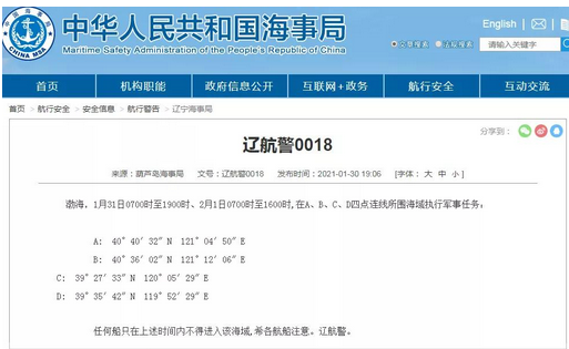 任何船只在上述时间内不得进入该海域,希各航船注意。辽航警。
