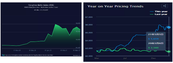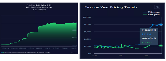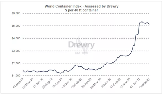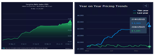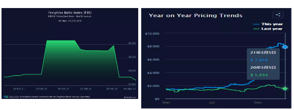 然而,到3月5日,即期运价再次飙升至4,709美元/ FEU。