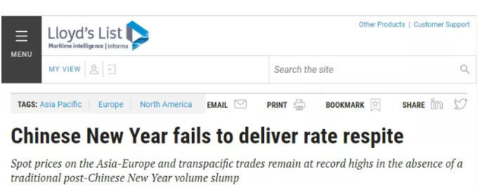 劳氏日报表示,在中国春节后没有出现传统货运量急剧下滑的情况下,亚欧和跨太平洋贸易的即期运费仍处于历史高位;