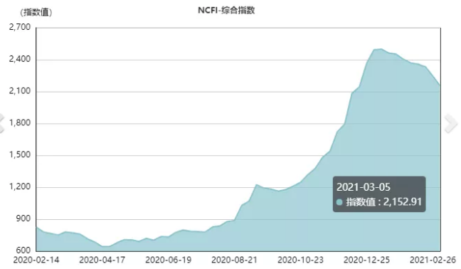 21条航线中有5条航线运价指数上涨,16条航线运价指数下跌。