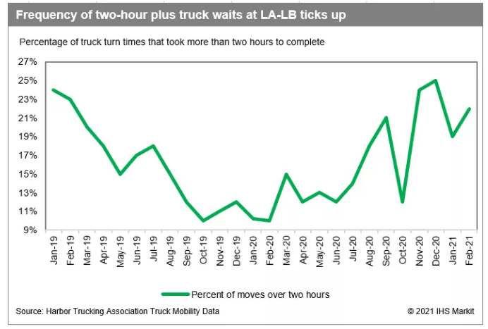 目前,几乎供应链的每个环节都面临挑战。太平洋商船协会(PMSA)的数据显示,1月份,这些码头的集装箱平均停留时间达到了创纪录的5.1天,高于12月份的4.99天。