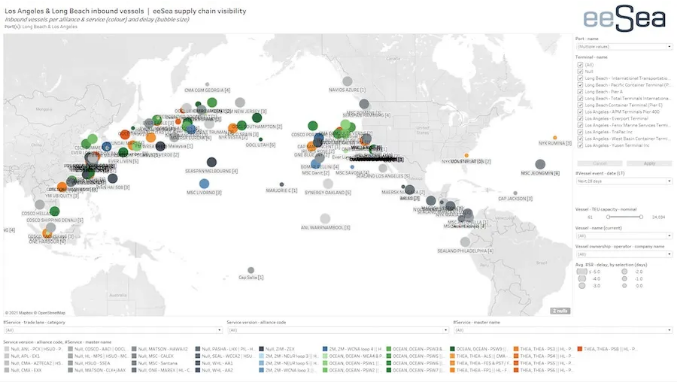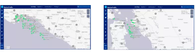 港口面临的问题是,入境船只的数量丝毫没有减少,下面的eeSea地图清楚地显示了未来28天内所有前往洛杉矶和长滩的入境船只。
