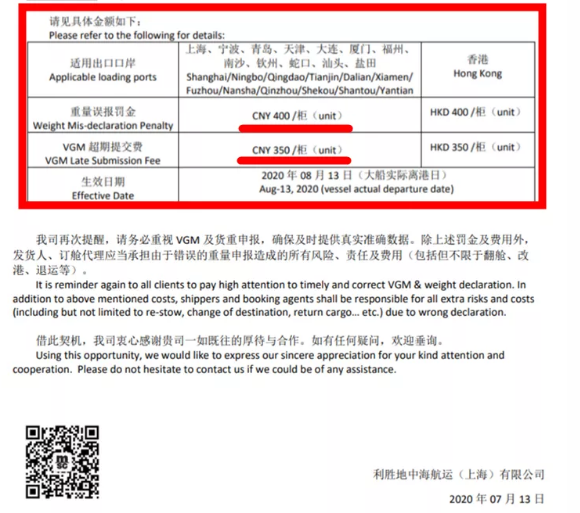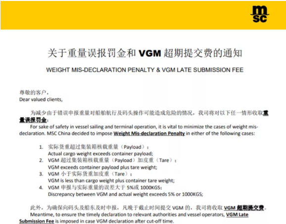 长荣国际船务(深圳)有限责任公司As Agent for2020年8月此前MSC发布通知,为减少因错误申报重量对船舶航行以及码头操作可能造成的危险情况,将收取重量误报罚金和VGM超期提交费!最高400元/柜!