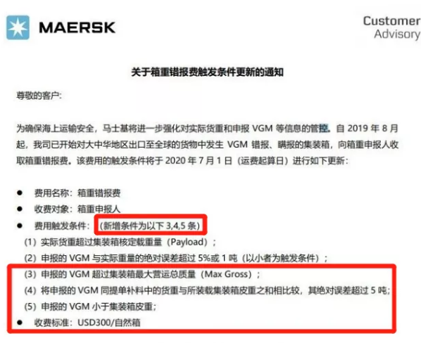 (2)申报的 VGM 与实际重量的绝对误差超过 5%或 1 吨(以小者为触发条件);