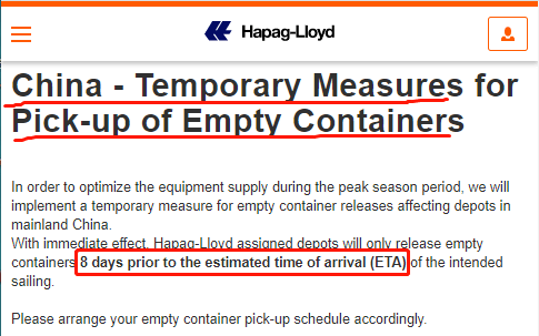 为优化设备在旺季的供应,我们将对中国内地仓库的空箱放行实施临时措施。从即日起,赫伯罗特指定的仓库只会在预定航次的预计到达时间前8天释放空箱。