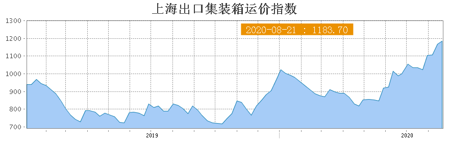 8月21日,上海航运交易所发布的上海出口集装箱综合运价指数为1183.70点,继续上扬态势,较上期上涨1.4%,比一年前高出53%。各航线运价总体稳定,略有上调,综合指数上涨。