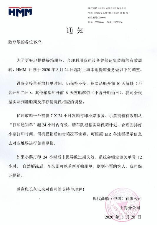 HMM发布通知, 于2020年8月24日起对上海本地提箱业务做以下的调整。