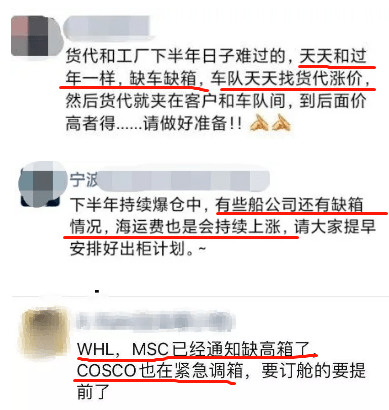 其他各大船公司虽无具体公告,但也有货代同行在朋友圈陆续发布消息称万海、MSC、COSCO等船公司均在紧急调箱。