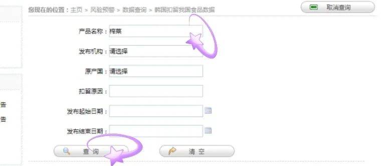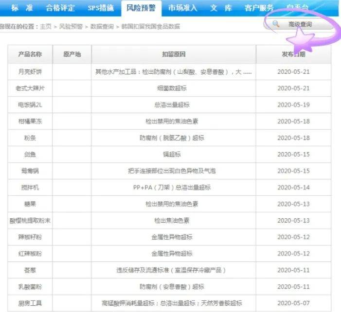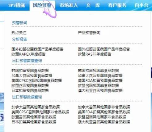 在技贸网首页选择风险预警,此处我们以查询韩国扣留我国食品数据为例。