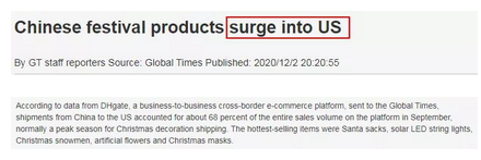 根据跨境电子商务平台DHgate发送给《环球时报》的数据,从中国到美国的发货量约占该平台9月份总销量的68%。圣诞装饰运输的旺季。最畅销的商品是圣诞老人麻袋,太阳能LED灯串,圣诞节雪人,人造花和圣诞节面具。