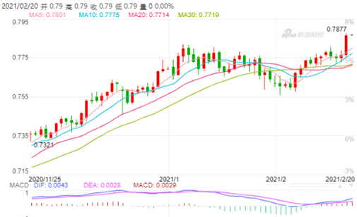 这还没完,进入到2021年,澳元继续上涨,在前几天2月底,兑美元更是达到0.7877!