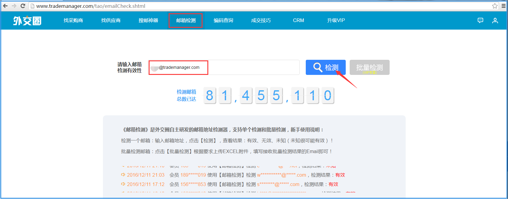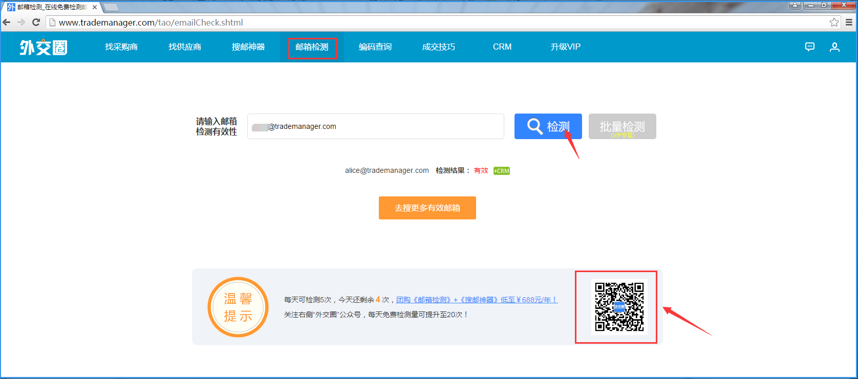 四、点击导航栏的邮箱检测,输入一个需要检测的邮箱,然后点击检测就来到检测结果页面,扫描检测结果页面的二维码关注外交圈微信公众号