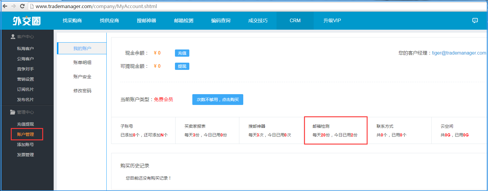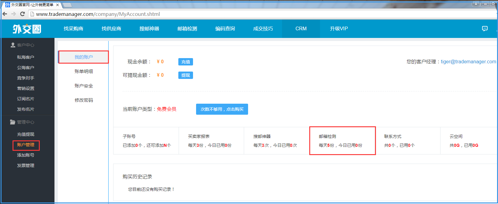 三、登录账号后先点击CRM然后再点击CRM中的账户管理,在我的账户那里可以看见你能使用的权限,你会发现目前的邮箱检测次数是5次