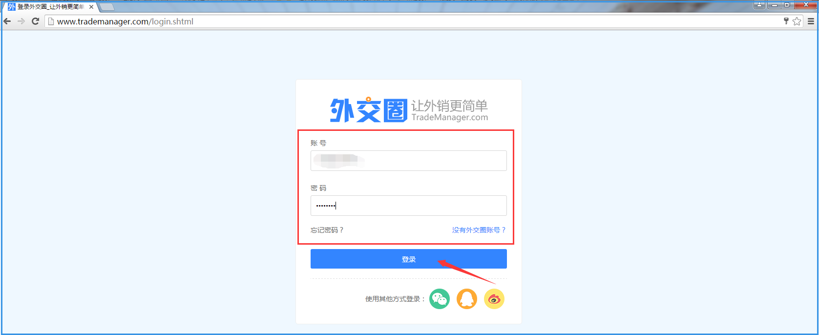 二、 已有账号的用户点击登录输入自己的外交圈账号,没有账号的用户点击注册,注册一个自己的外交圈账号(注册后补充完整公司资料方可使用外交圈平台的功能)