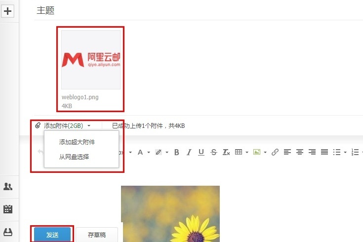 3、如果您需要随信附上文件或者图片,可点击“添加附件”,在弹出的对话框中,选择您要添加的附件后点“打开”即可;或直接将图片粘贴在编辑器中。已上传附件上面有“X”按钮,也可删掉不要的附件。若要添加多个附件,请重复点击“继续添加”;要添加较大附件建议您占击选项,添加超大附件或从网盘选择。