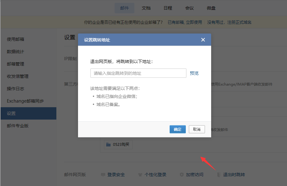 可登陆邮箱关联的企业微信管理端—协作—邮件—设置—退出时跳转,输入指定地址(比如公司网站、个性化登陆页面等),那么成员登录邮箱后选择右上角“退出”便会退出到指定地址。