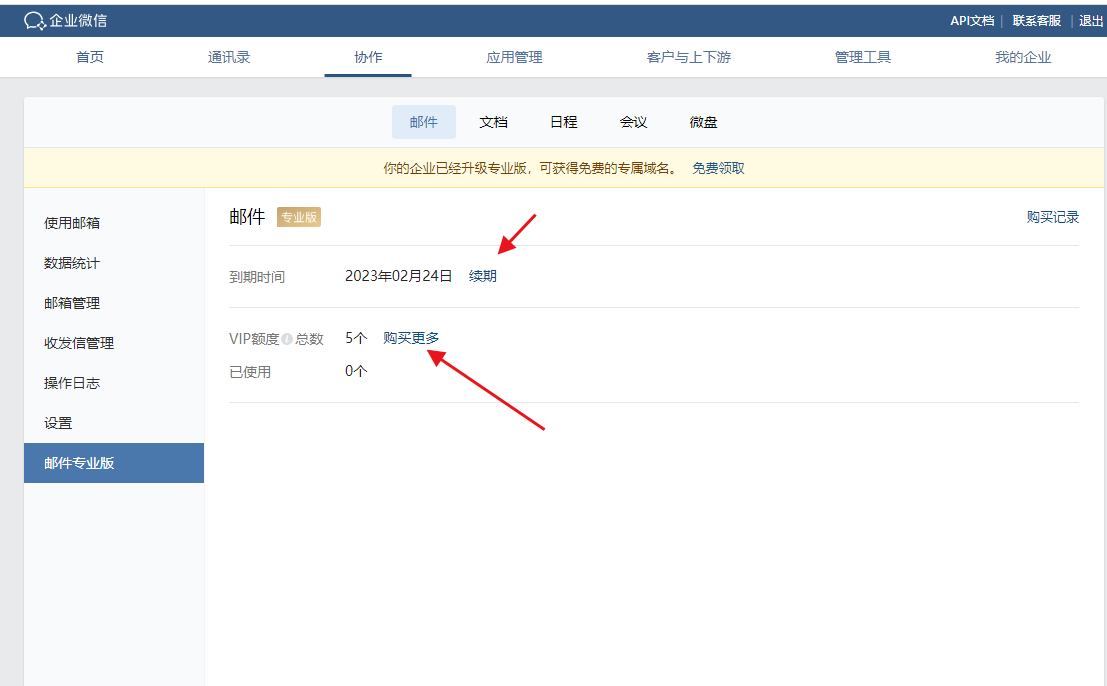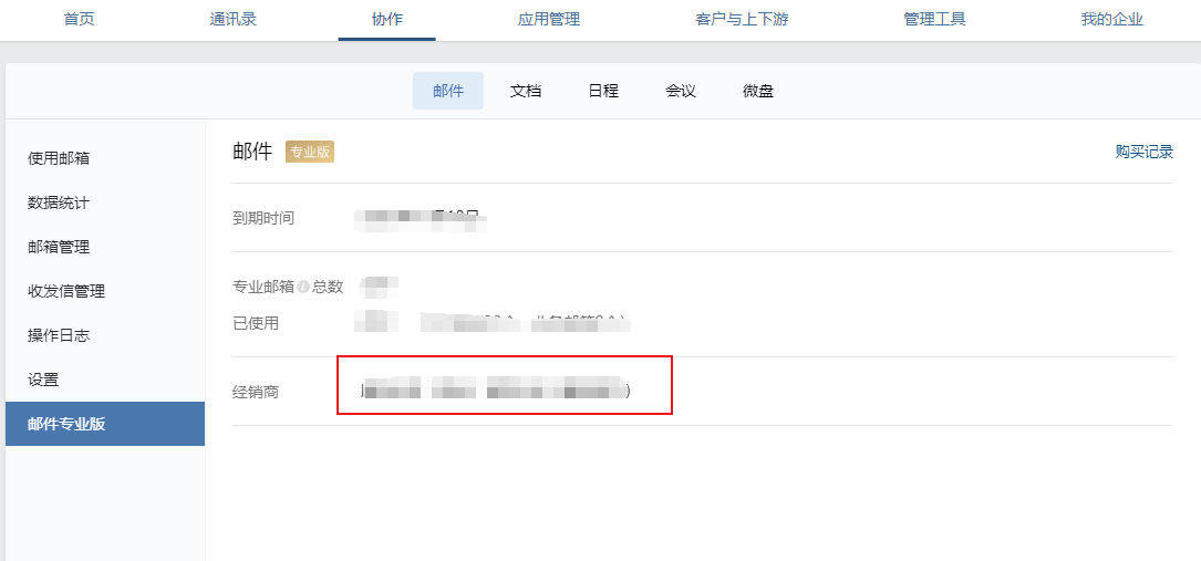 2.若是通过经销商购买的专业版服务,需要联系您的经销商进行续费或是扩容。请登录管理员后台—协作—邮件专业版查看经销商名称和联系方式。