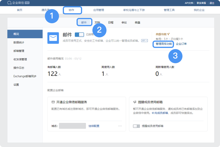一、若是在线自助购买邮箱的用户,请登录【企业微信管理员后台->协作->邮件->概况】进行续期和扩容高级功能使用人数。