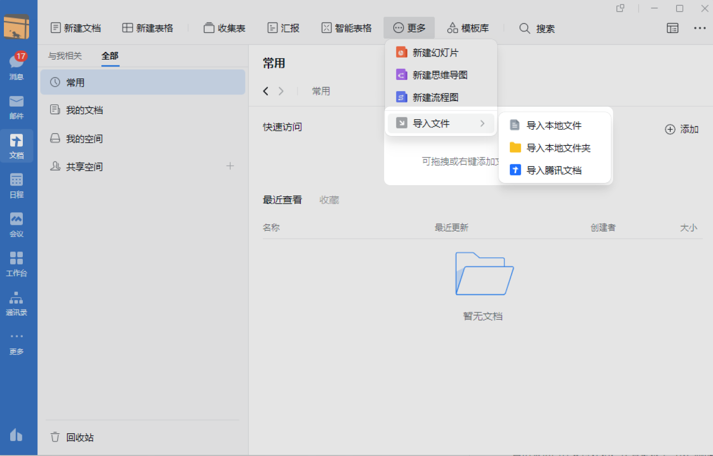 在电脑端打开文档后,可以点击【页面上方导航栏->更多->选择进行导入】。