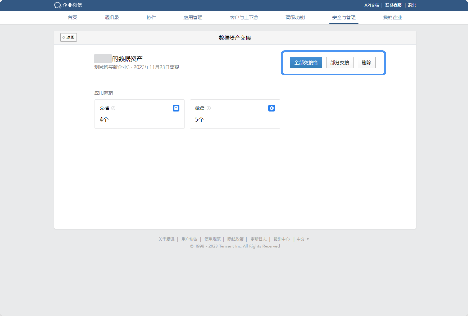 (1)可选择全部交接、部分交接、删除离职成员的文档、微盘文件。