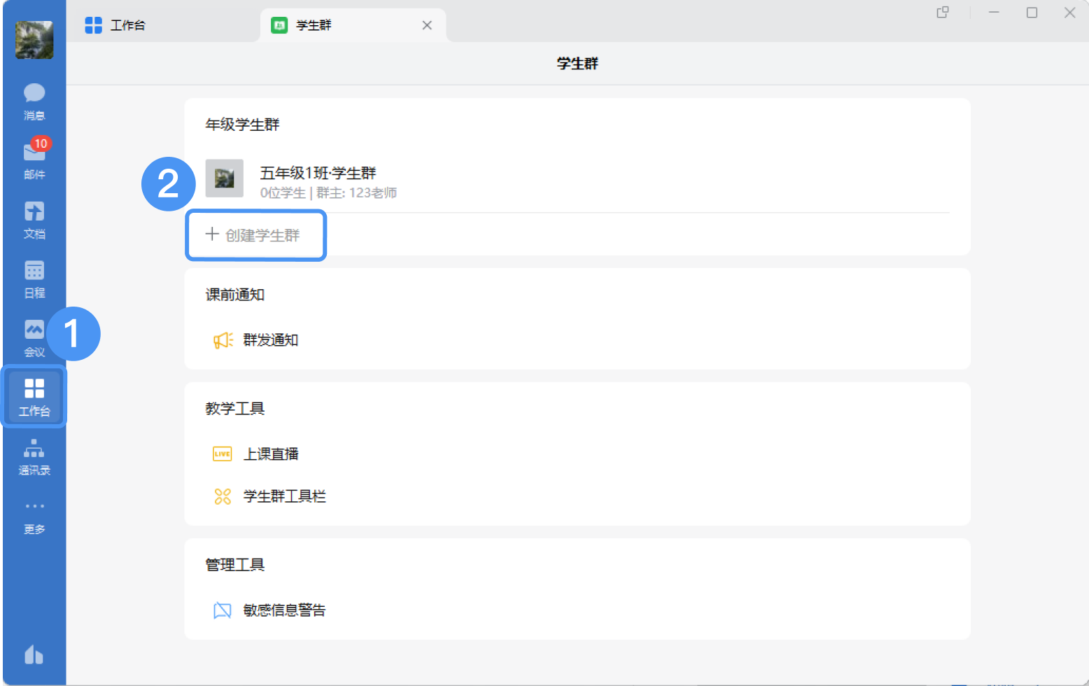 【手机端/电脑端->工作台->学生群->创建学生群】