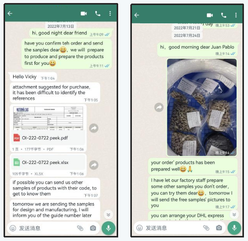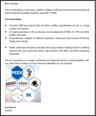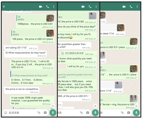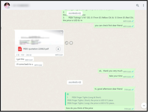 通过图片,按照以往的经验,我们推断出买家需要的产品大概是液相PEEK接头,别克的产品中正有此类,但是具体型号可能稍有差异。我们首先给这位买家发送了PEEK相关的产品资料。前期的沟通很顺利,客户爽快的发来了采购清单。