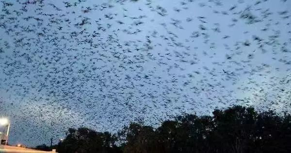 在澳洲当地时间上周,频繁有密密麻麻的蝙蝠群出现在天空中,先是有25万只蝙蝠侵入布里斯班北部,后有15万只蝙蝠在附近的邦加里的天空盘旋。