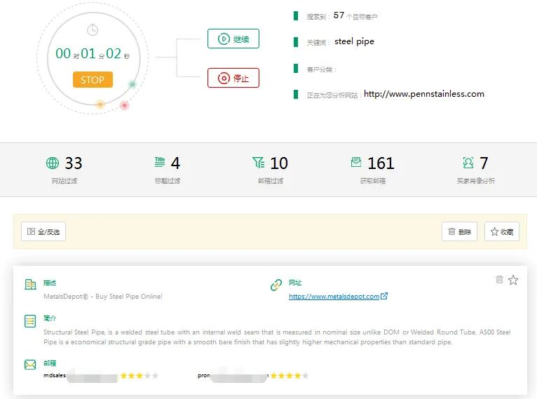 通过设定关键词,进入搜索模式,短短一分钟57个买家信息呈现。有了筛选处理的数据,加上系统自定义评级,就可以进入开发信模式。