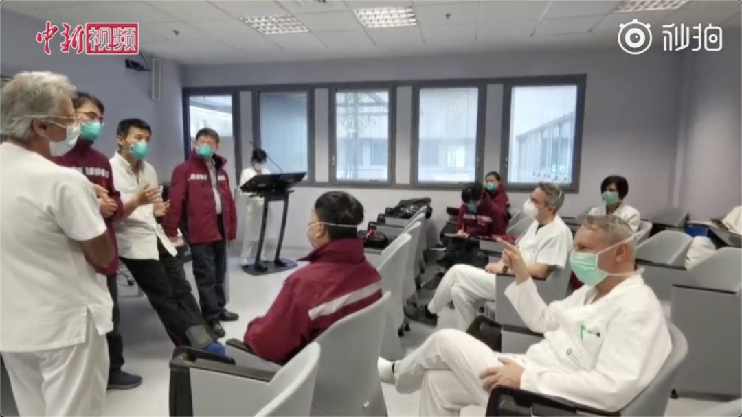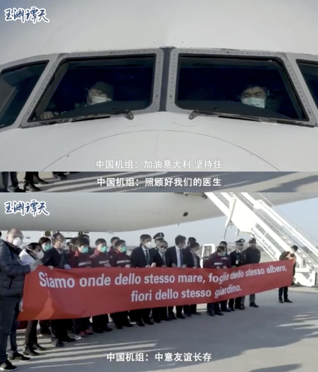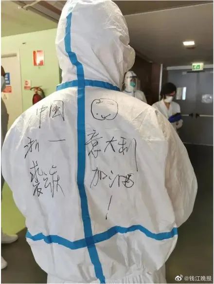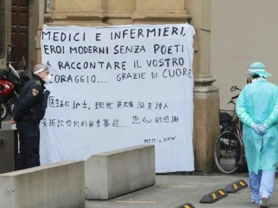 △ 意大利圣玛丽亚医院门前的一张写字板,用歪歪扭扭的意大利语和中文写道:“医生和护士,现世英雄,没有诗人来诉讼你们的英勇事迹,忠(衷)心的感谢”。