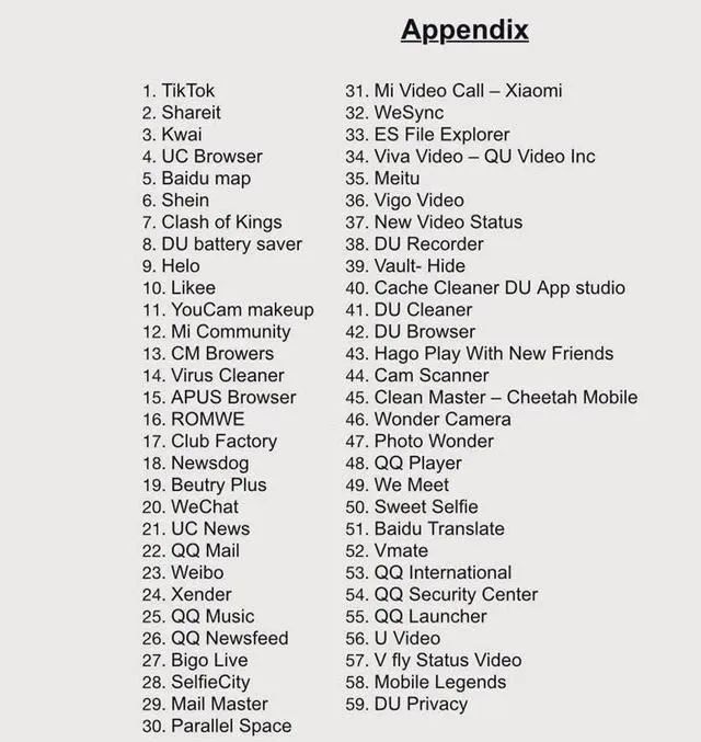 6月29日晚,印度政府突然宣布禁止在印使用包括抖音海外版(TikTok)、微信(WeChat)、微博、QQ邮箱、UC浏览器等在内的59款“中国APP”,理由是这些APP会危害印度“主权完整、国家安全和公共秩序”。