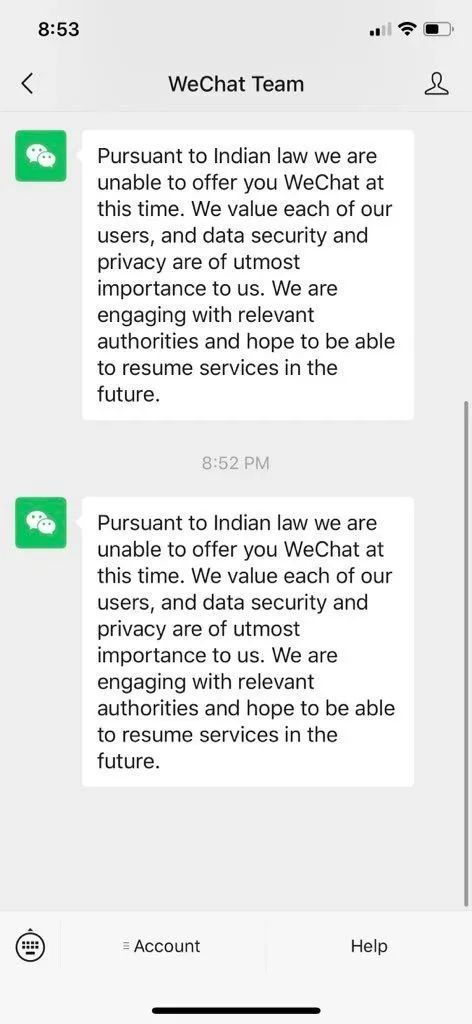 微信在给用户的通知中称,“根据印度法律,我们目前无法为您提供微信服务。我们重视每一位用户,数据安全和隐私对我们来说是最重要的。我们正在与相关部门接触,希望未来能够恢复服务。”
