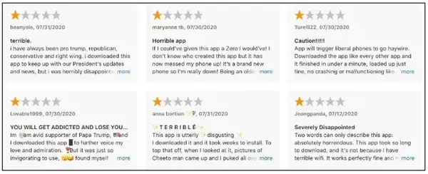 目前,特朗普竞选app的在苹果应用商店的评价区已经收到十几万颗1星,总评分一度跌到1.2颗星;在安卓的应用商店,评分一度跌到1.1颗星。