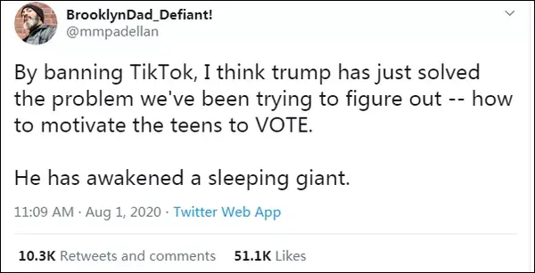有人在推特上讽刺说,特朗普封禁TikTok的举动,解决了美国一直头疼的问题,即如何激励青少年投票。“他唤醒了深睡中的巨人。”该条推特截至8月1日已获得上万转发、5万多点赞。