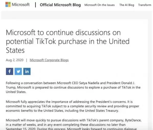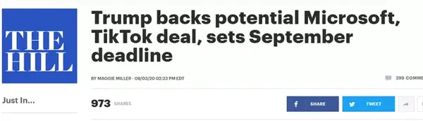 截止8月4日下午发文为止,事态的发展已经几经曲折,现在,特朗普下了强制令,给微软和字节跳动45天的时间来谈收购事宜。