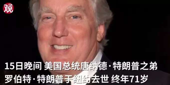 据美联社8月16日报道,美国总统唐纳德·特朗普的弟弟罗伯特·特朗普(Robert Trump)在当地时间周六(8月15日)晚间去世,享年71岁,美方至今未公布死因及详细情况。