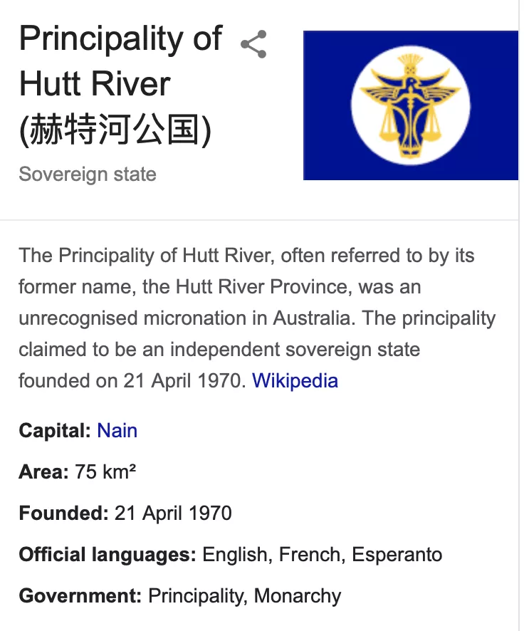实际上还真的有,这个国家名字叫Principality of Hutt River,中文叫赫特河公国,首都是Nain,并且号称澳洲“第二大国家”。