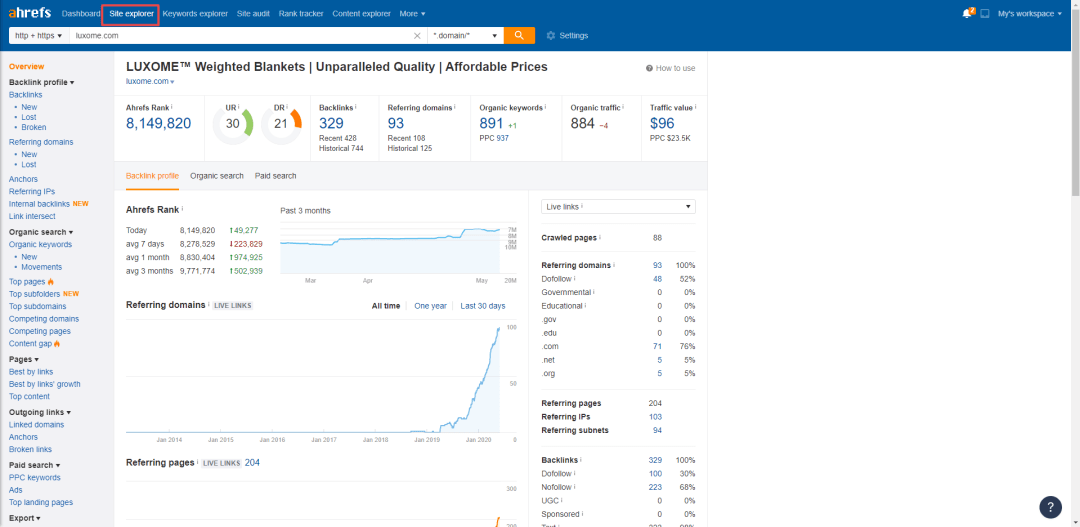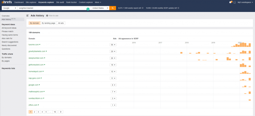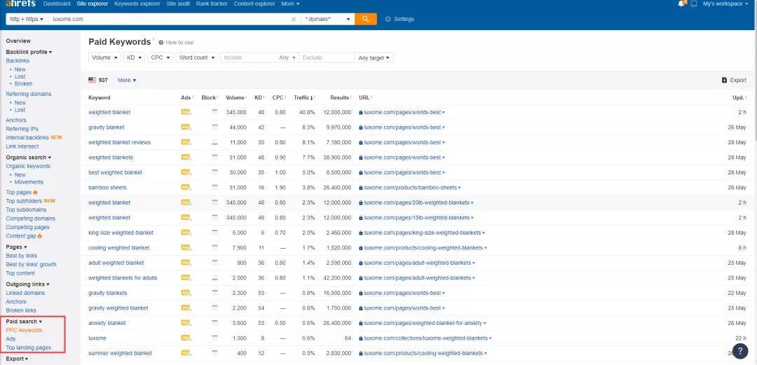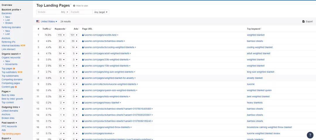 利用ahrefs的keywordsexplore工具,先找出在做广告的网站(以weighted blanket这个产品为例)