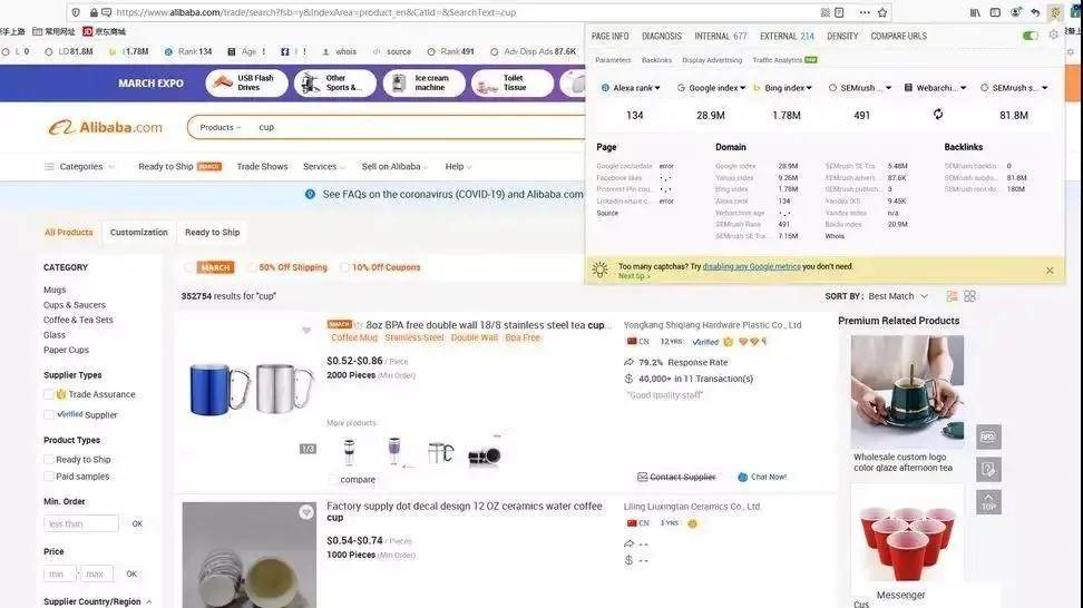 安装SEOquake插件后,在Google搜索出的每个搜索结果下会出现主要关键指标,打开某个页面后点击右上角SQ小图标可以查看整个页面详细SEO信息。